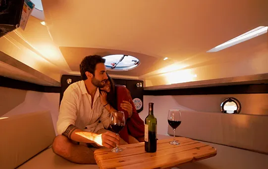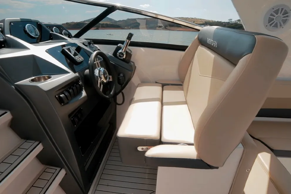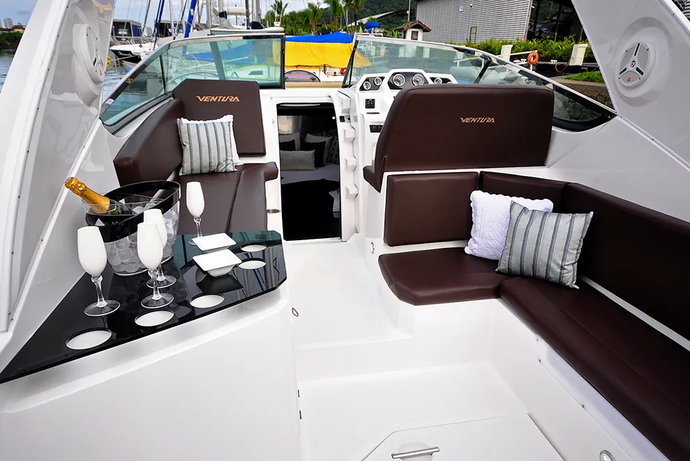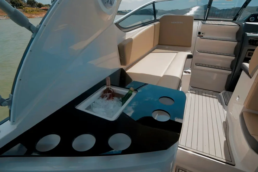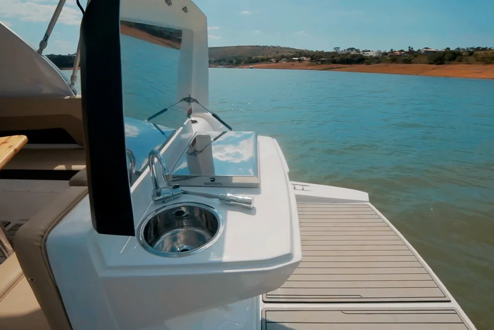 Única embarcação do mercado com cozinha interna que de geladeira, micro-ondas, fogão elétrico e adega de vinhos comporta instalação